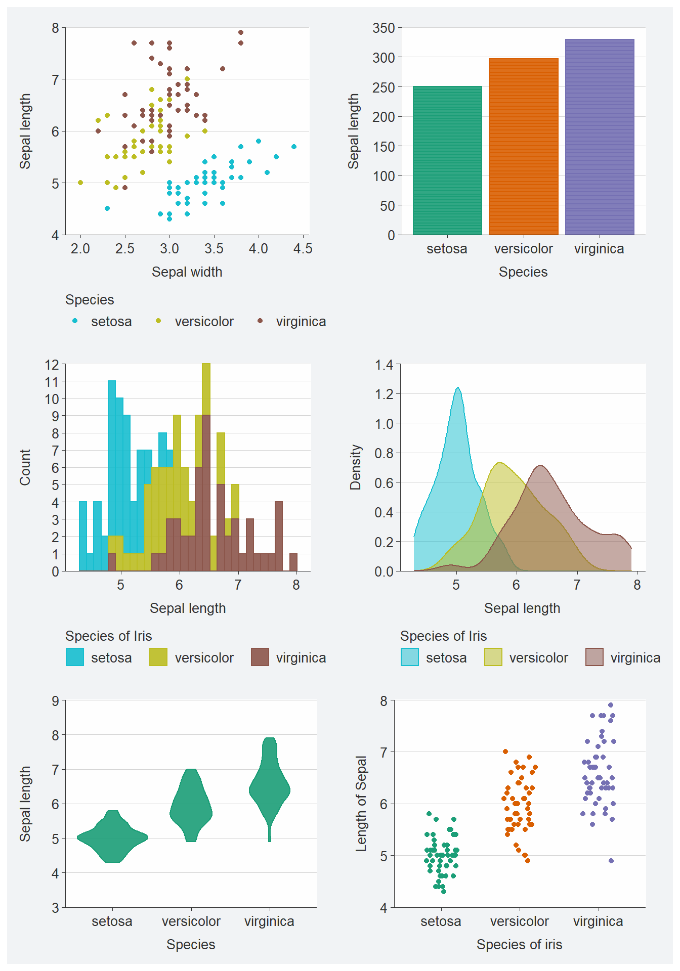 pal = brewer.dark2(3))(p1+p2)/(p3+p4)/(p5+p6)# 拼图`stat_bin()` using `bins = 30`. Pick better value with `binwidth`.