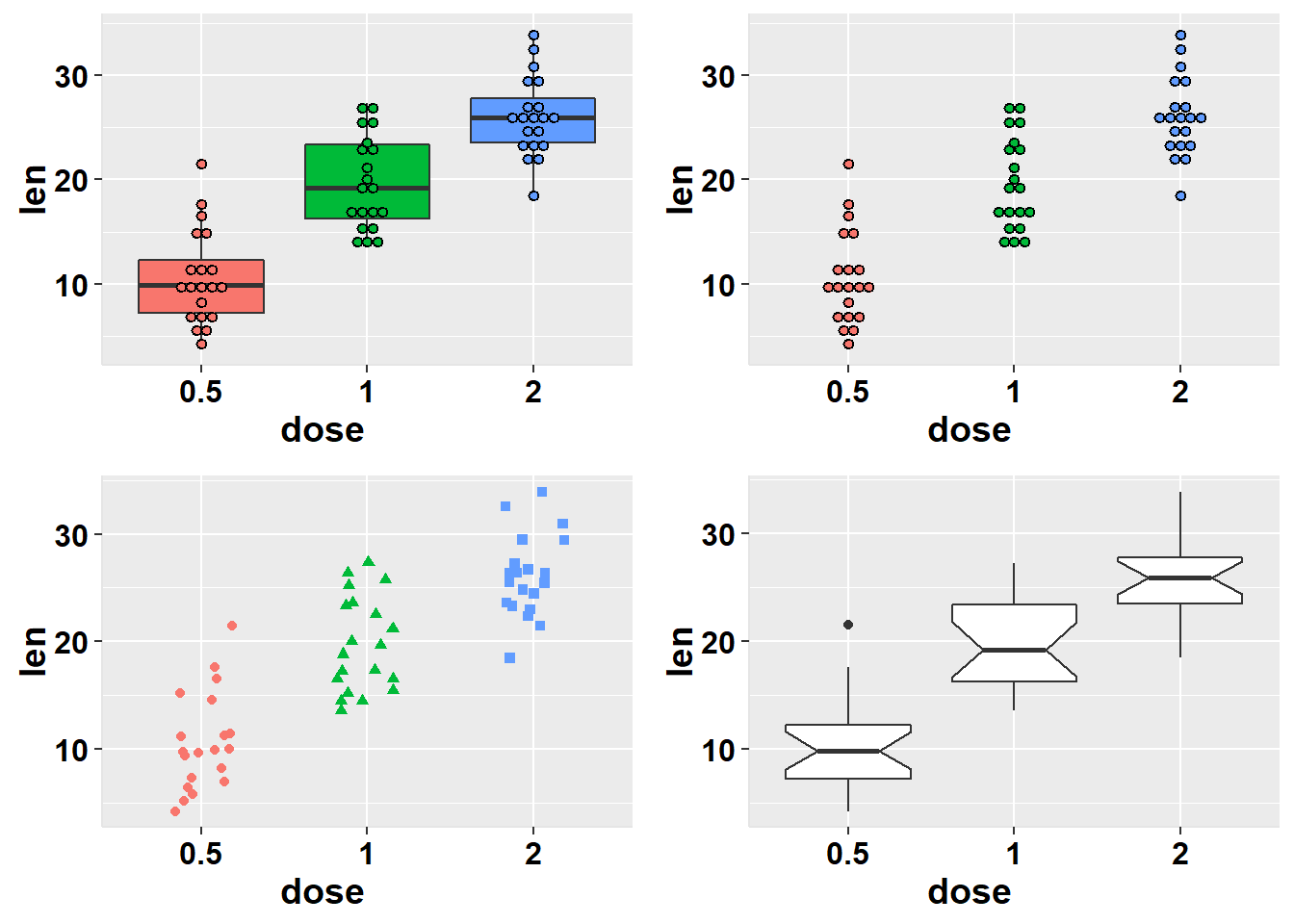 groupName='dose', showLegend=FALSE) # Notched box plot