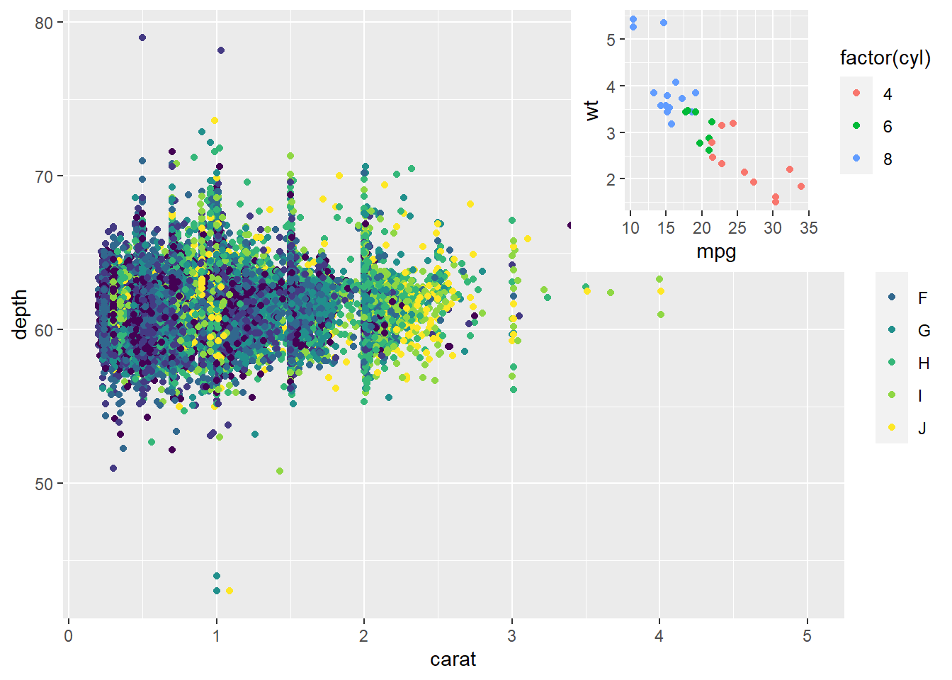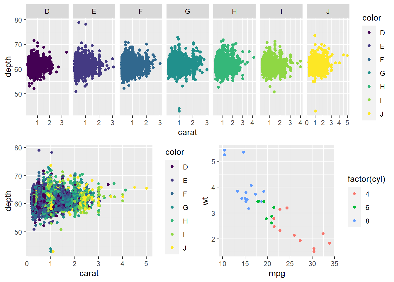 a <- ggplot(diamonds, aes(carat, depth, colour = color)) + geom_point()