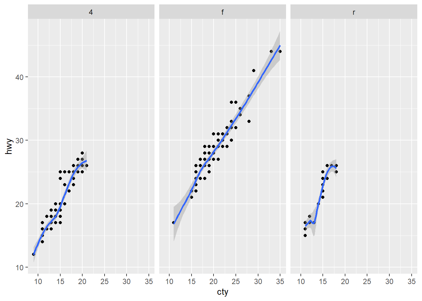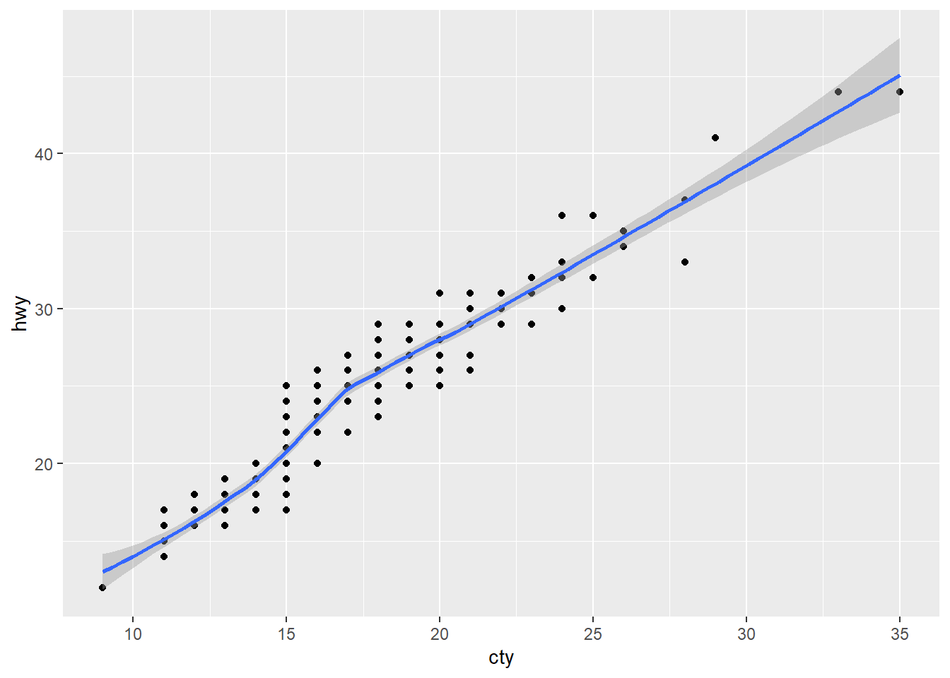 p<-ggplot(mpg)+aes(cty,hwy)+geom_point()+geom_smooth();p`geom_smooth()` using method = 'loess' and formula 'y ~ x'