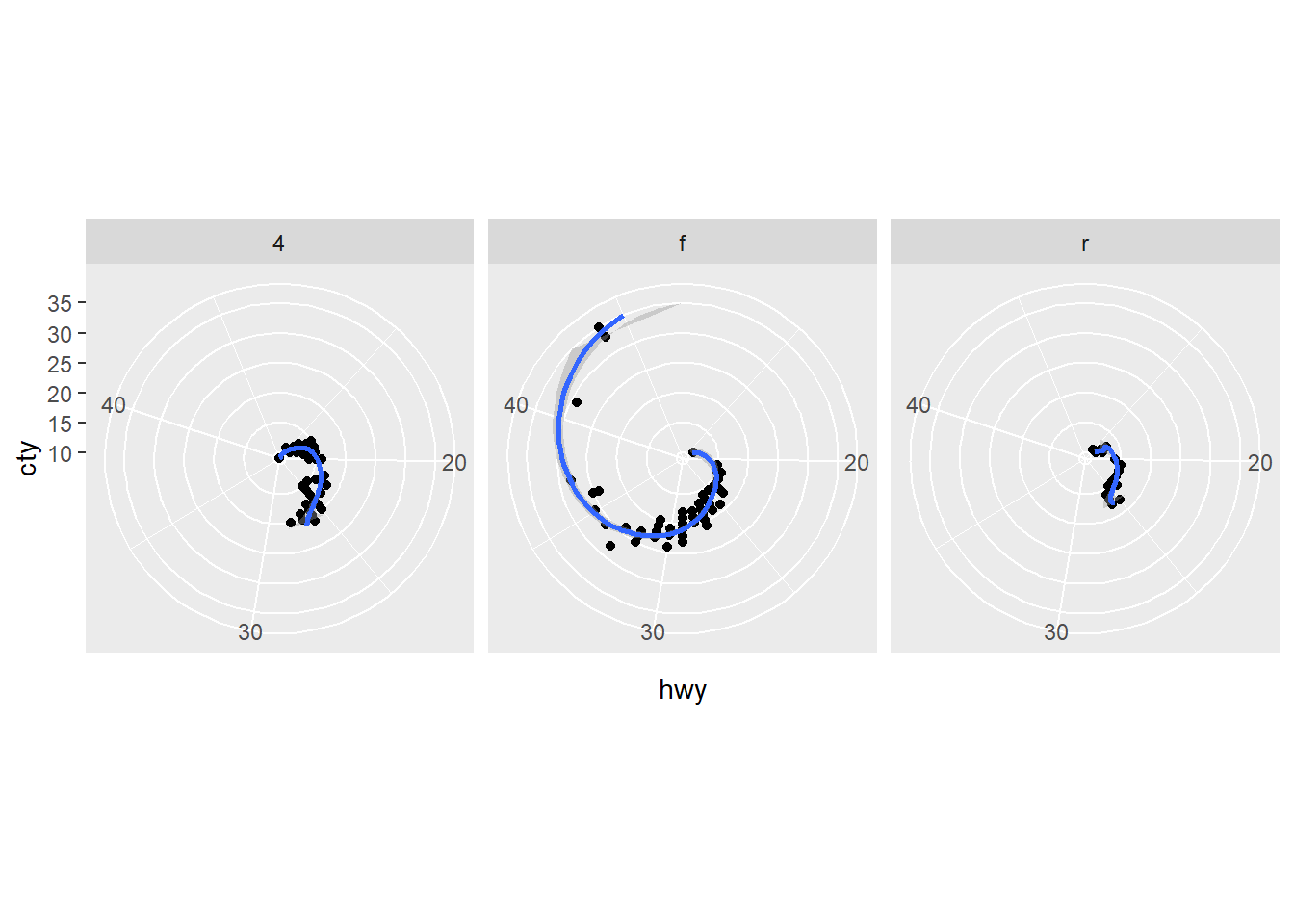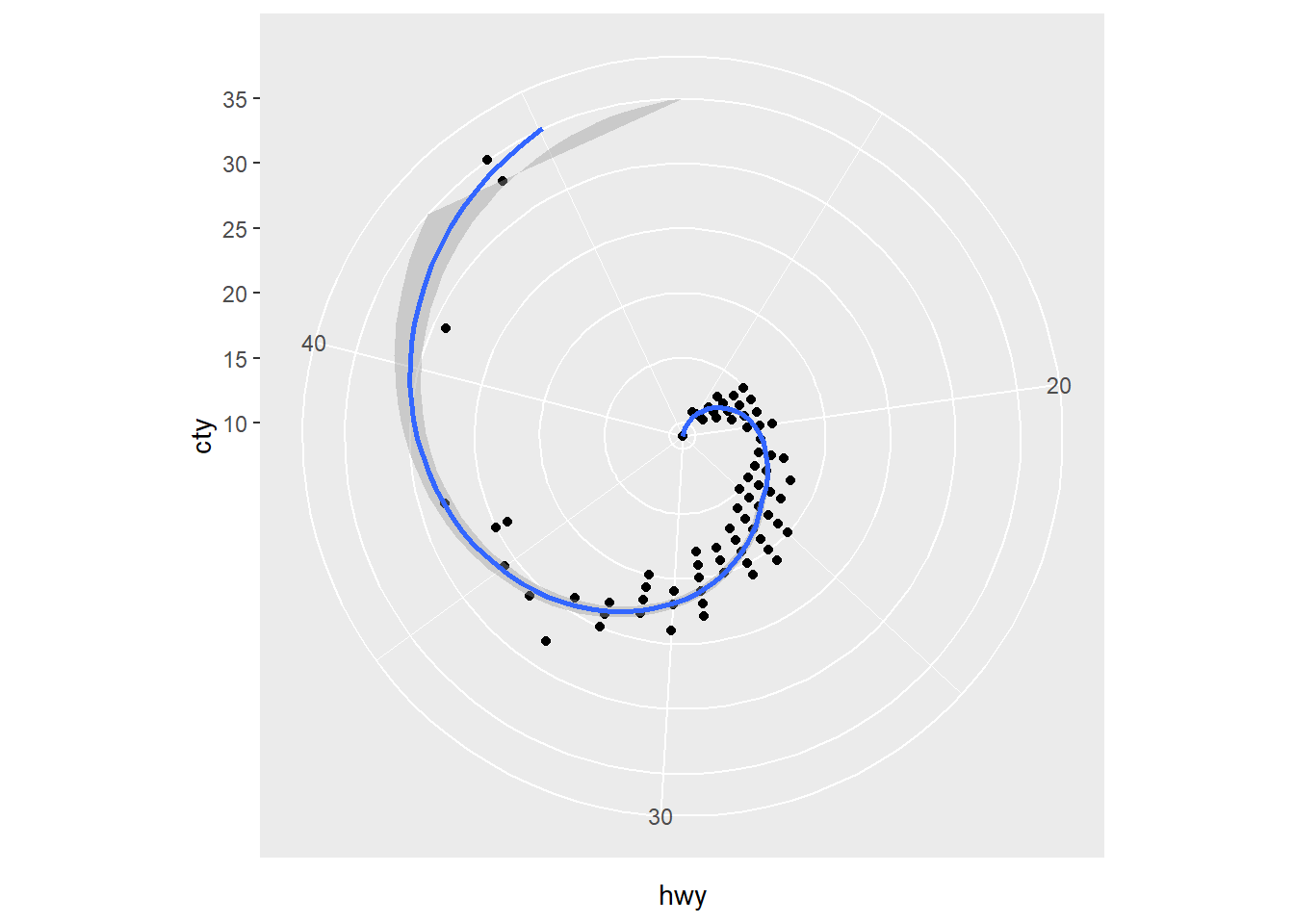 p<-ggplot(mpg)+aes(cty,hwy)+geom_point()+geom_smooth()+coord_polar(theta = "y");p`geom_smooth()` using method = 'loess' and formula 'y ~ x'