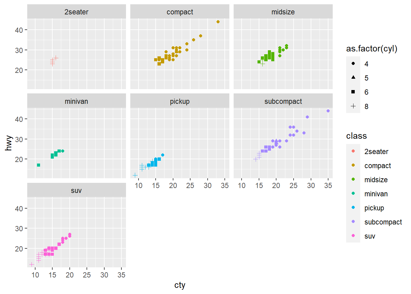 geom_point(aes(cty,hwy,color=class,shape=as.factor(cyl)))+