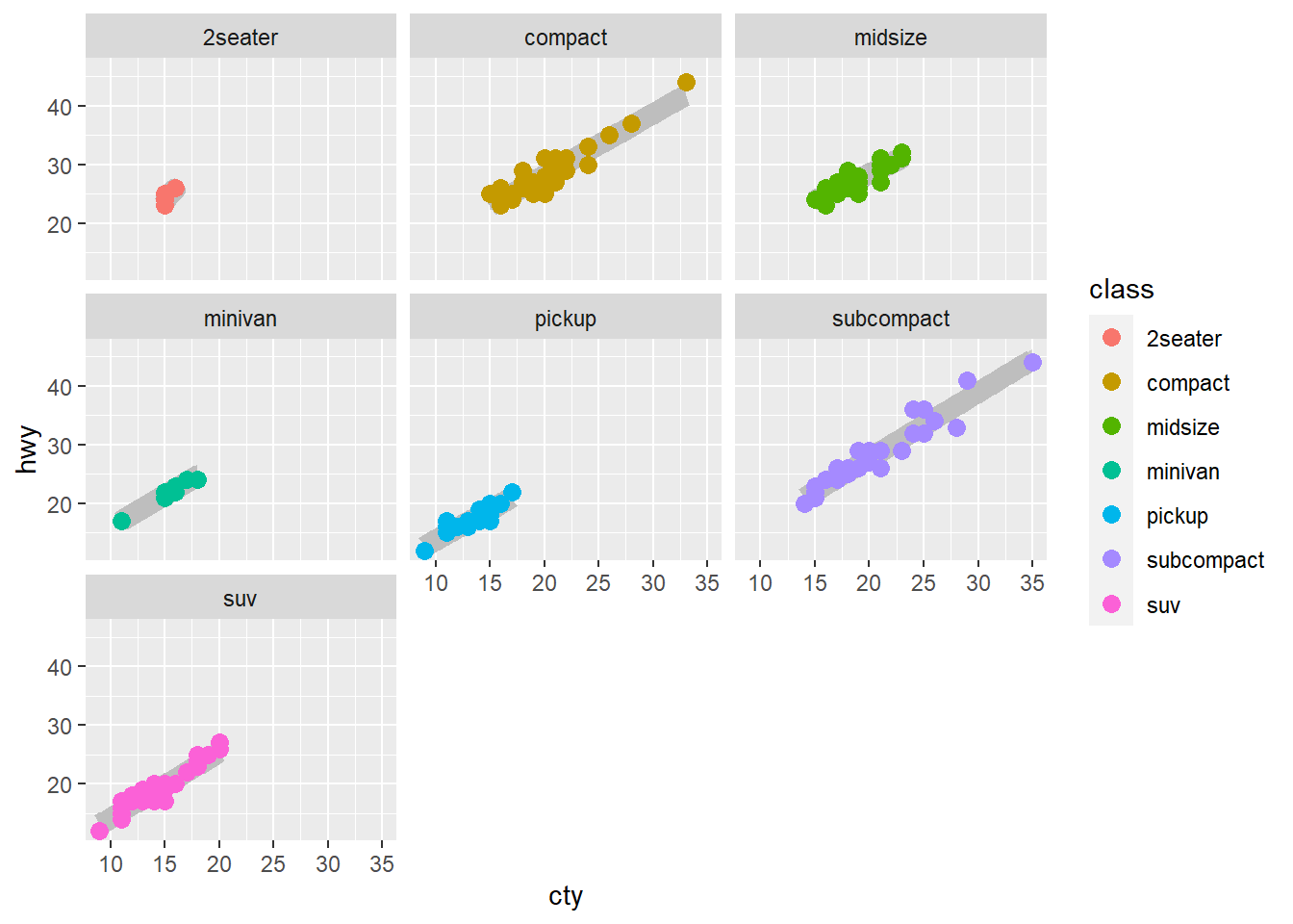 facet_wrap(~class)`geom_smooth()` using formula 'y ~ x'
